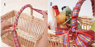 選一條長的絲帶在竹筐的提手上打上漂亮的蝴蝶結(jié),這樣,簡潔而有新意。